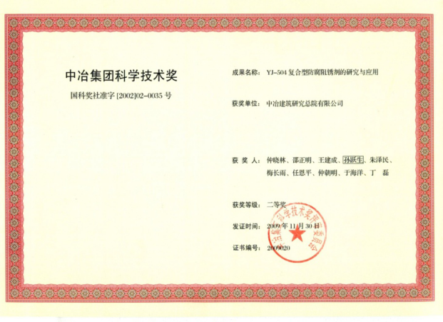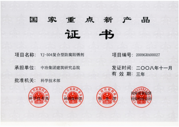 7、YJ-504复合型防腐阻锈剂获科技部、环境保护部、商务部、国家质检总局联合颁